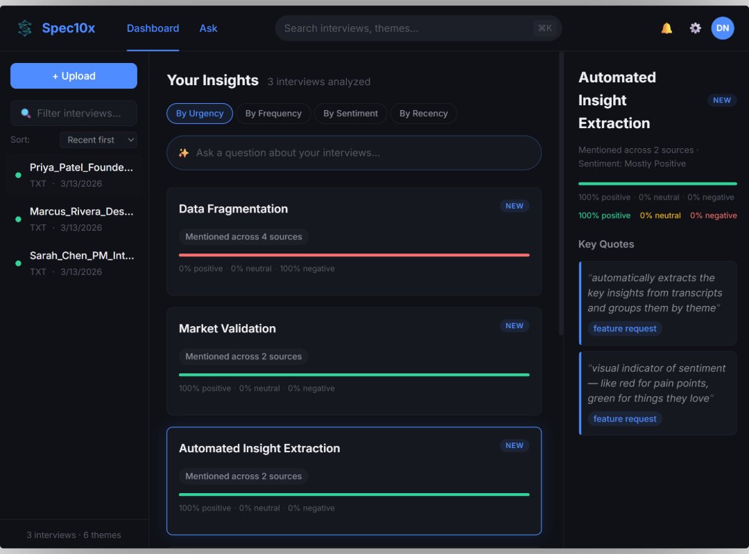 Our AI highlights core pain points from raw interview transcripts in real-time. No more manual tagging or missing key details.